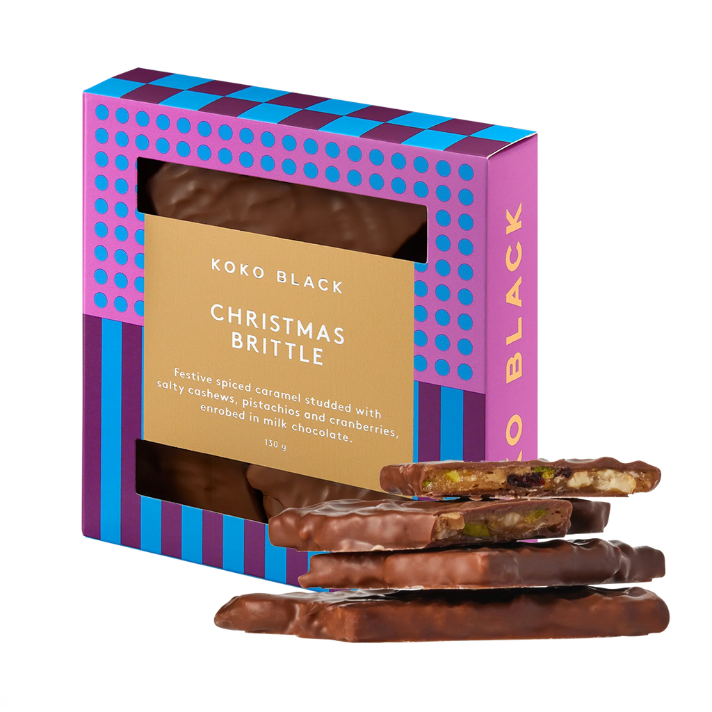 Ingredients: Sugar, Milk Chocolate (Sugar, Cocoa Butter, Whole Milk Powder, Cocoa Mass, Emulsifier [Soya Lecithin], Natural Vanilla), Glucose Syrup, Roasted Salted Cashews (Cashews, Canola Oil, Salt), Water, Sweetened Cranberries (Cranberries, Sugar, Vegetable Oil), Pistachios, Butter (Pasteurised Cream [From Milk], Water), Sodium Bicarbonate, Christmas Pudding and Cake Spices (Cassia, Coriander, Ginger, Nutmeg, Cardamom), Cinnamon, Sea Salt.