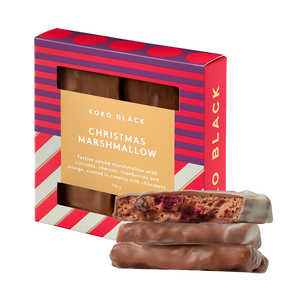 Festive spiced marshmallow with currants, cherries, cranberries and orange, coated in creamy milk chocolate.